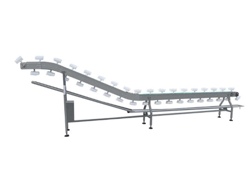 条状物提升机适用于辣条、东北酸菜等产品,通过人工摆放的方式,可以控制朝向,接着由提升机自动把物料倒入到袋中。